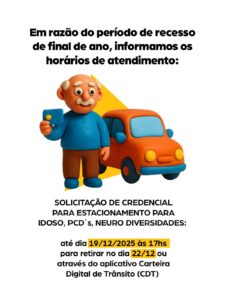 Para quem necessitar fazer a solicitação de credencial para idoso, PCD e neuro diversidades, deve protocolar até o dia 19/12, às 17 horas para retirar no dia 22/12, ou pelo aplicativo CNH, antiga CDT. O mesmo calendário serve para quem precisar de autorização para ocupação de solo.