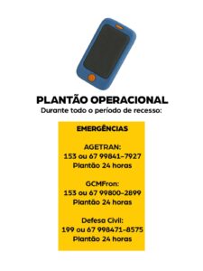 GCMFron: 153 ou 67 99800 2899; AGETRAN: 153 ou 99841 7927 e da Defesa Civil: 153 ou 67 99847 8575.