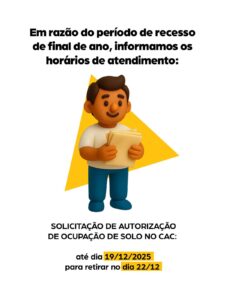 Para quem necessitar fazer a solicitação de credencial para idoso, PCD e neuro diversidades, deve protocolar até o dia 19/12, às 17 horas para retirar no dia 22/12, ou pelo aplicativo CNH, antiga CDT. O mesmo calendário serve para quem precisar de autorização para ocupação de solo.