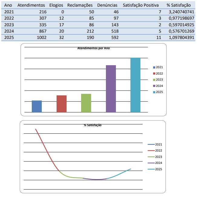 As informações estão organizadas por ano, permitindo acompanhar a evolução dos indicadores de satisfação, identificar pontos de melhoria e orientar a tomada de decisões administrativas. Os dados apresentados contribuem para o aperfeiçoamento dos serviços, o aumento da eficiência operacional e o fortalecimento da participação social.