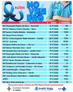 A Prefeitura de Ponta Porã, por meio da Secretaria Municipal de Saúde, está desenvolvendo diversas ações alusivas à campanha Novembro Azul, voltada à prevenção e promoção da saúde do homem. As atividades estão sendo realizadas nas Unidades Básicas de Saúde dos bairros e do centro da cidade.